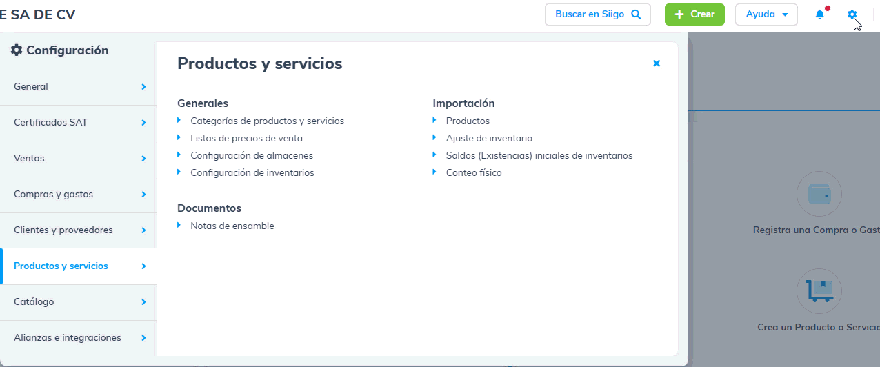 que corresponde a Configuración. Luego, selecciona Productos y servicios – Importación – Saldos (Existencias) iniciales de inventarios.