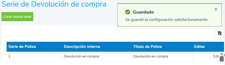 Siguiendo estos pasos, te aseguras de crear o dar de alta las series de devolución en compras.