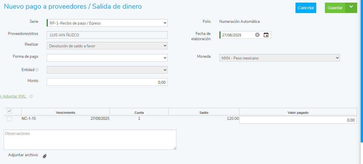 - Adjuntar XML: subir o vincular el archivo XML relacionado con la nota de crédito, y también tendrás la opción de borrarlo si es necesario.