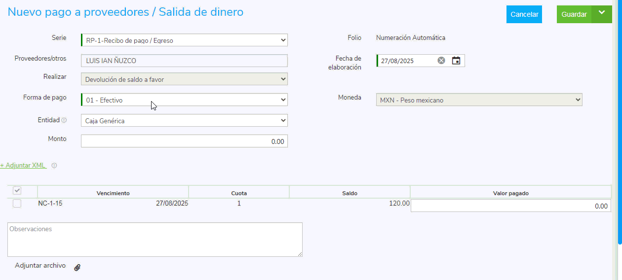- Entidad: selecciona la caja o cuenta desde donde se realizará el registro del pago.
