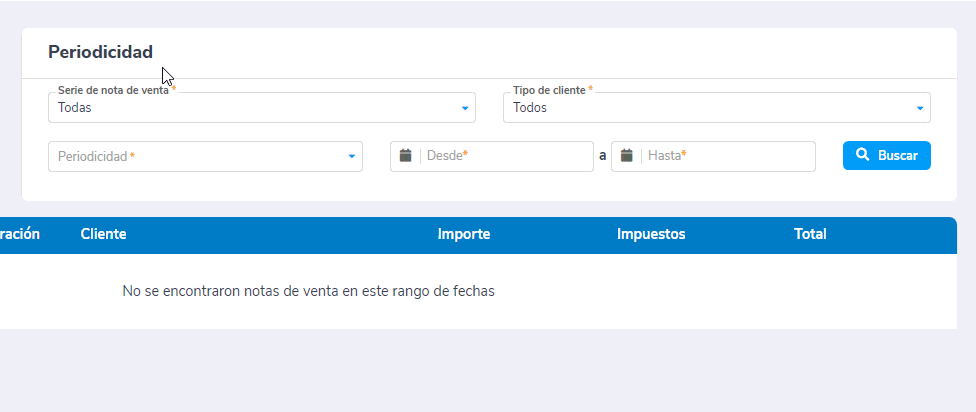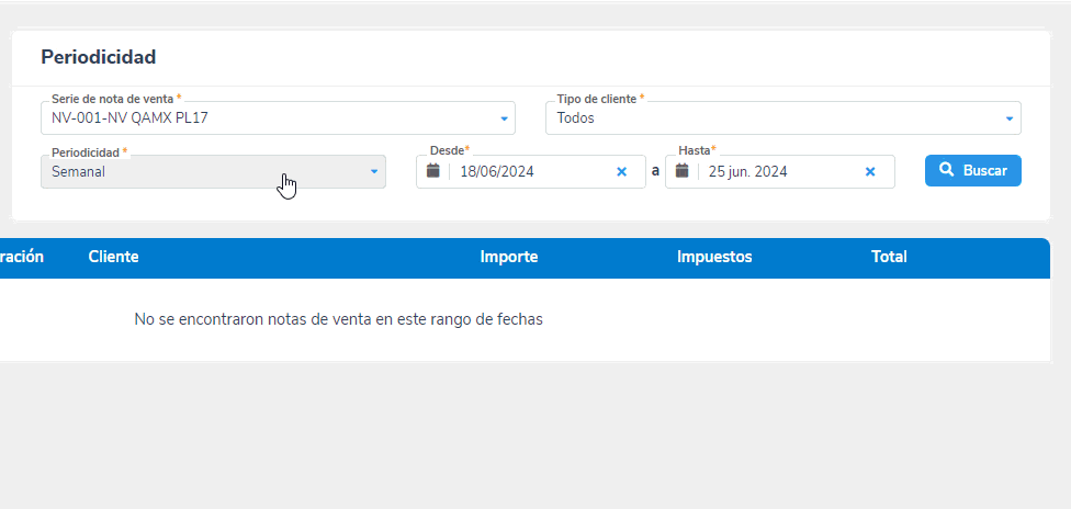 En caso de seleccionar diario, te mostrará la fecha a consultar las notas de venta a enlazar y si eliges semanal, quincenal, mensual o bimestral, se activan 2 campos de rangos de fecha.