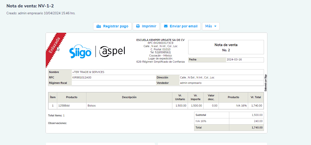 - Si la nota de venta fue enlazada con una factura global, te mostrará la siguiente leyenda, de enlazada.