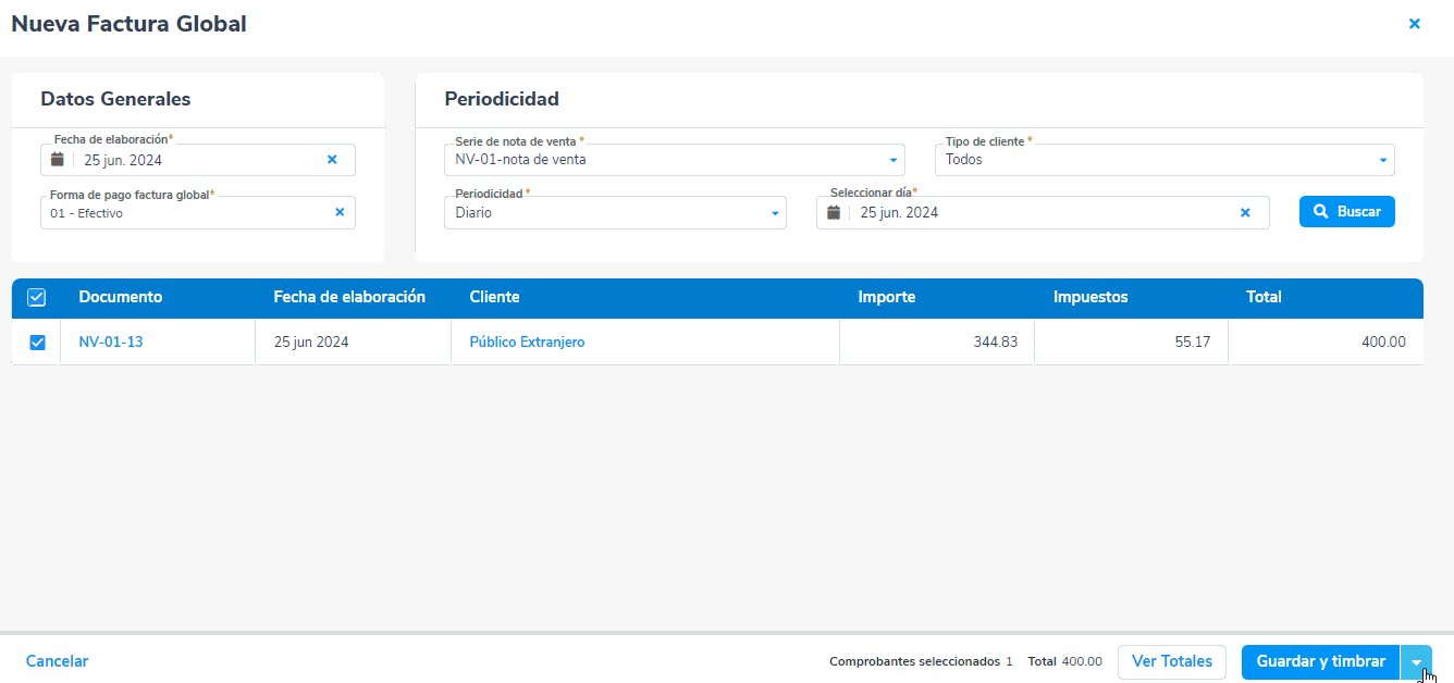 c. Periodicidad: Defines el rango si será: Diario, semanal, quincenal, mensual, Bimestral. Se recomienda utilizar la misma periodicidad en todas las factura globales.