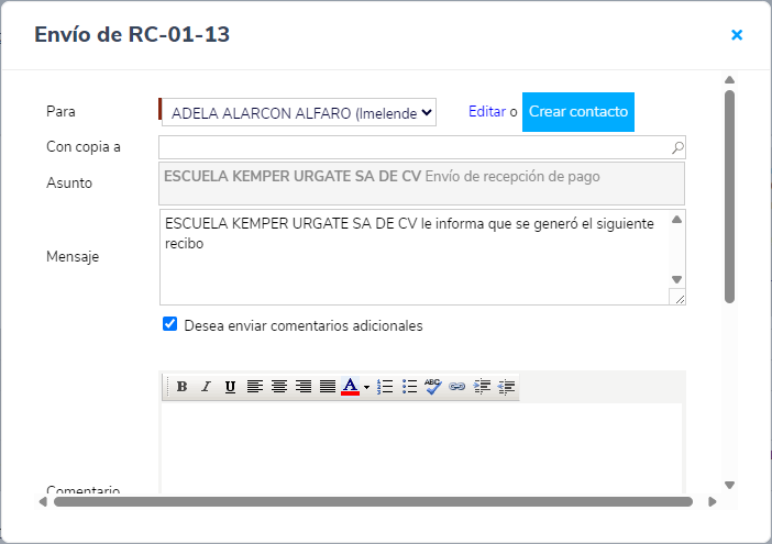 4. Una vez que das clic en el botón Guardar y enviar, se mostrará una ventana donde podrás confirmar los datos del contacto y el correo electrónico al que se enviará la recepción de pago.