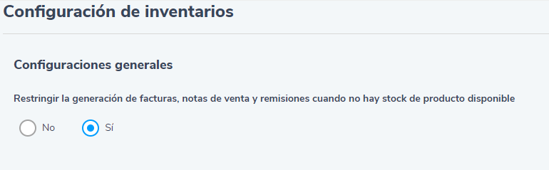- No (opción predeterminada): permite crear facturas, remisiones o notas de venta aunque no tengas existencias disponibles. Puedes vender sin restricción, pero podrías registrar ventas por encima del inventario real.