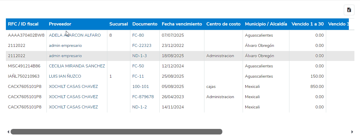 y el sistema te listará por cada plazo de tiempo el valor por pagar a cada uno de los proveedores de forma detallada.