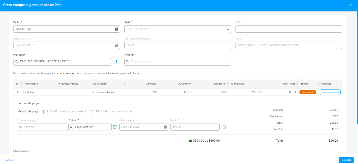5. El sistema leerá automáticamente los datos del archivo XML e importará información como la fecha de emisión, serie y folio, UUID (Identificador Único Universal) y el nombre del proveedor (RFC del emisor).